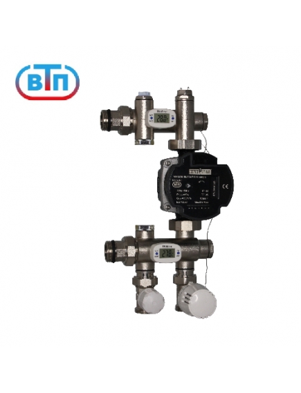 Узлы состоят из блоков подачи (1) и возврата (2), объединённых циркуляционным насосом (3) с помощью накидных гаек (4). На обоих блоках предусмотрены термометры (13).