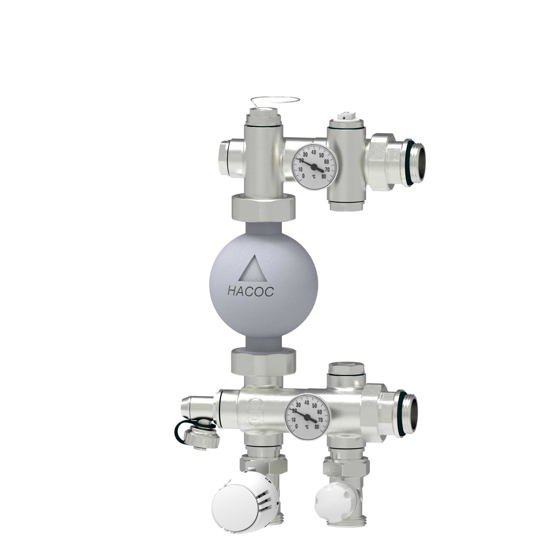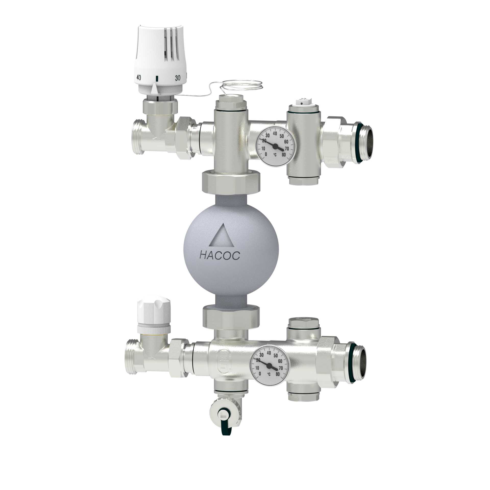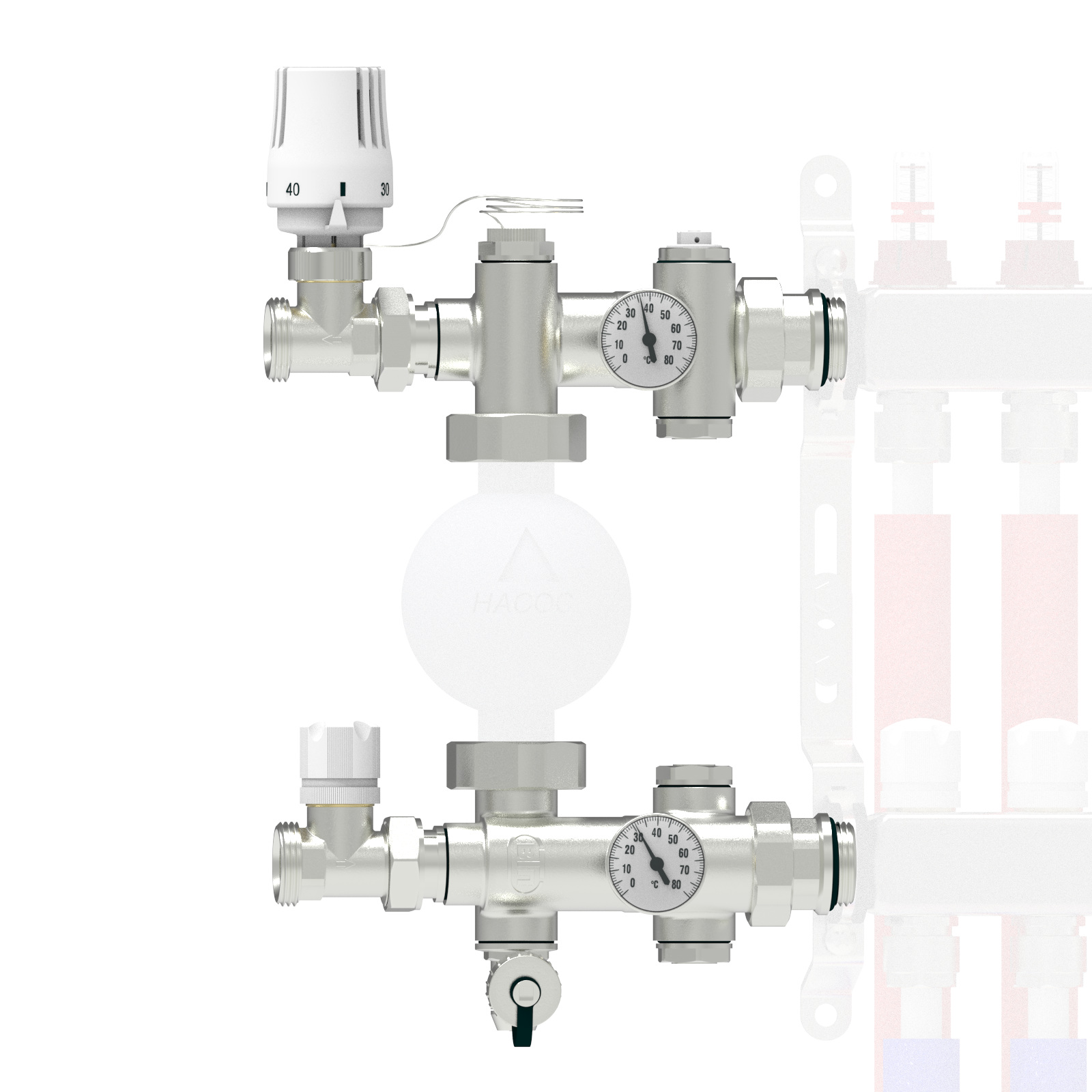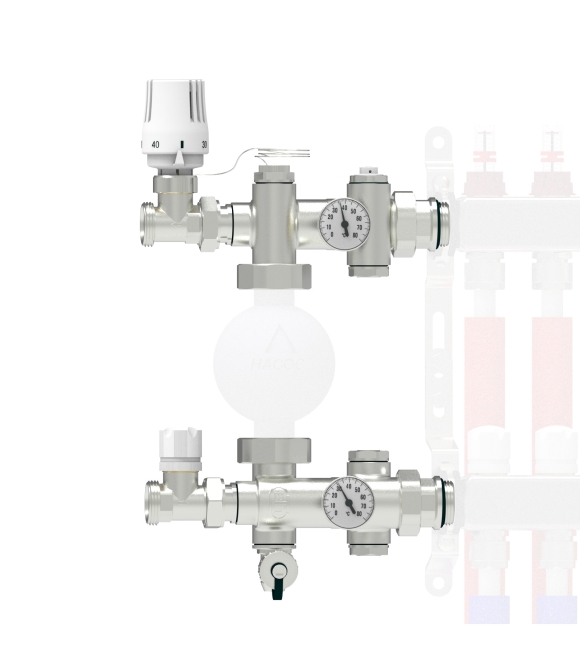 Поддержание его температуры осуществляется подмесом теплоносителя из источника тепла, количество которого корректируется регулирующим клапаном, с помощью термостатической головки, датчик которой отслеживает температуру теплоносителя, подаваемого в контуры.