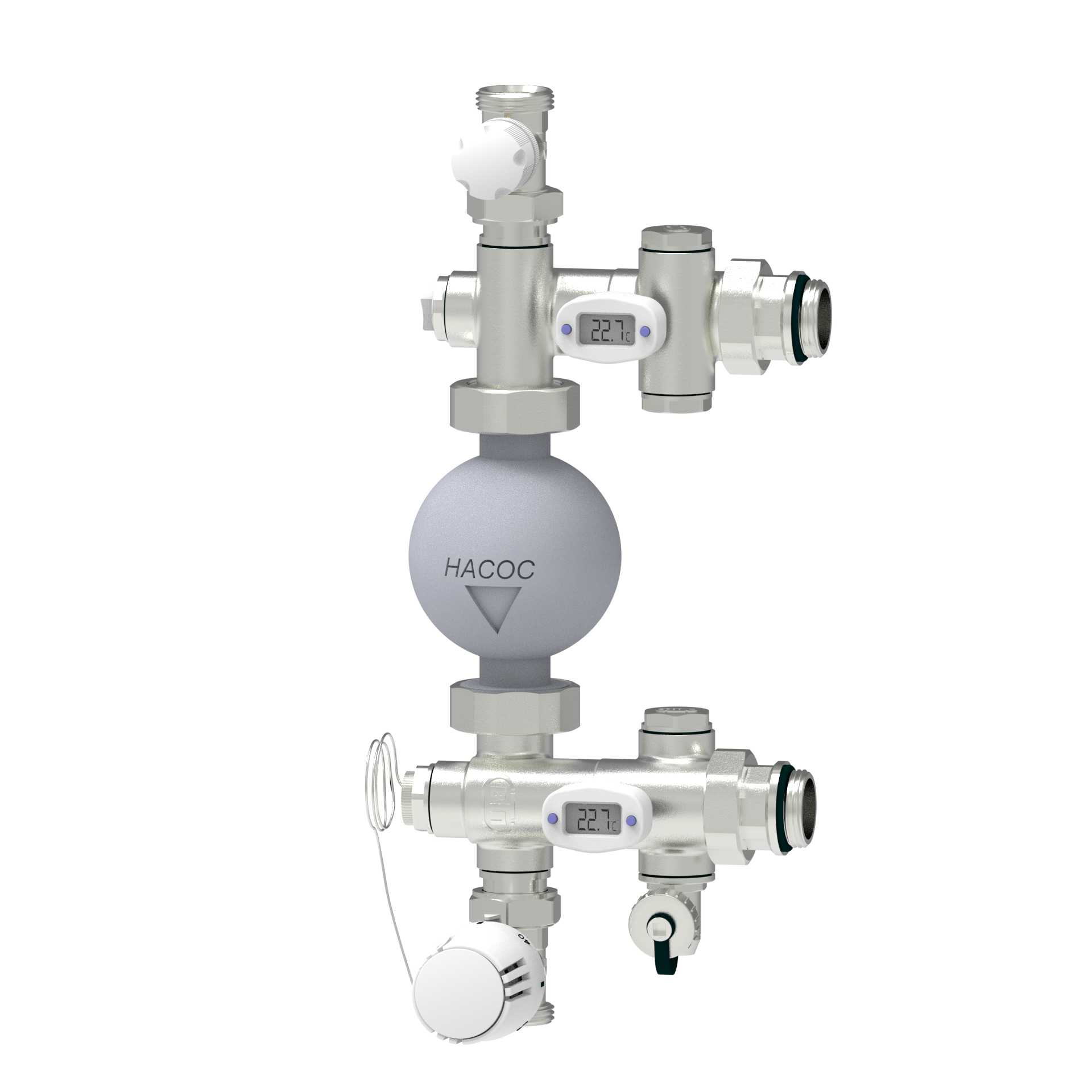 В качестве регулирующей и управляющей арматуры применяются клапаны нажимного действия, одна из снабженных термостатической головкой с выносным датчиком.