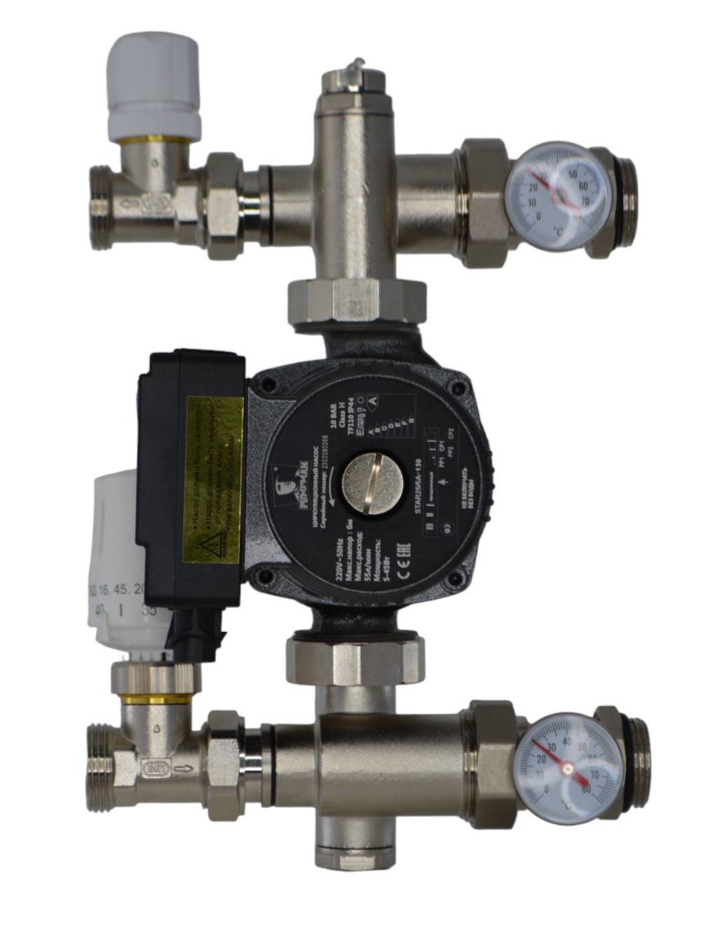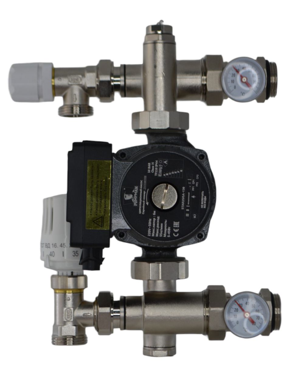 Насосно-Смесительный Узел КОМПАКТ-П, далее НСУ КОМПАКТ-П, предназначен для подготовки низкотемпературного теплоносителя и обеспечения его циркуляции через контуры системы отопления «Тёплый пол». Адаптирован для сопряжения с коллекторной группой, располагаемой с правой стороны от узла.
