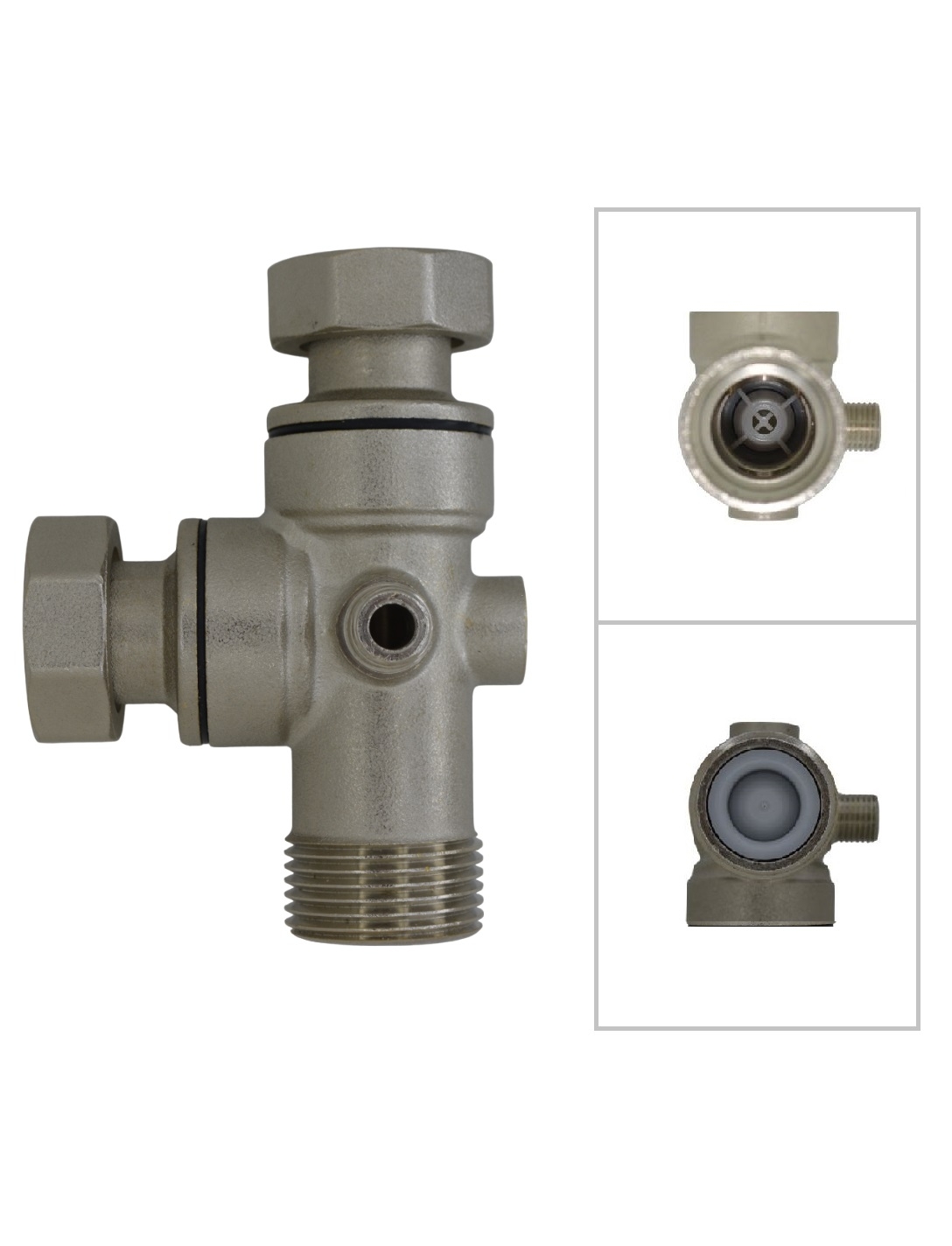 Патрубок с наружной резьбой 1/4" предназначен для крепления реле давления с накидной гайкой. Торцевая поверхность патрубка имеет достаточно большую поверхность, предназначенную для уплотнения соединения с реле давления, предотвращающую повреждение герметизирующей прокладки. Патрубок с внутренней резьбой 1/4" предназначен для установки манометра давления. В выходе с наружной резьбой 1" выполнена цилиндрическая полость с диаметром, обеспечивающим установку обратного клапана с кольцевым уплотнением изNBR70, которое позволяет извлечь обратный клапан для обслуживания или очистки. Клапан изготовлен с конфигурацией, создающей минимальное гидравлическое сопротивление протекающей жидкости. Клапан состоит нейлонового корпуса, штока с золотником и пружины из нержавеющей стали AISI 316, узел седла – из нейлоновой седельной обоймы и тефлонового седла, которые не подвержены коррозии и не способствуют отложению на клапане солей жёсткости, имеющихся в воде. Соединители со свободно вращающейся накидной гайкой предназначены для установки узла соединения на гидроаккумуляторе удобном положении и его фиксации. Соединитель устанавливается в выход с внутренней резьбой 1", соединение герметизируется посредством имеющегося на нём уплотнительного эластичного кольца.В комплекте с соединителем идет плоская прокладка из нитрил-бутадиен каучука NBR70. Узел соединения имеет компактные габаритные размеры, а конструкция позволяет устанавливать его в любом положении в пространстве.