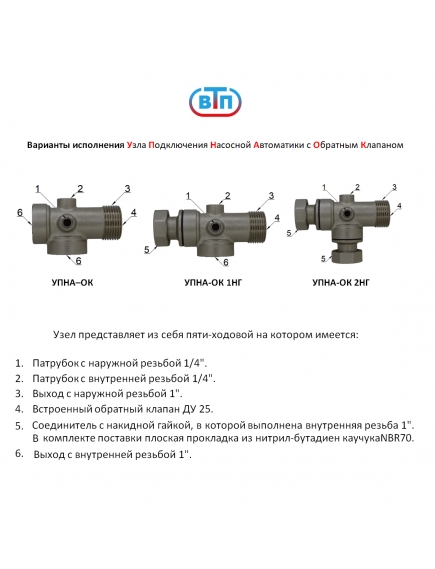 Патрубок с наружной резьбой 1/4" предназначен для крепления реле давления с накидной гайкой. Торцевая поверхность патрубка имеет достаточно большую поверхность, предназначенную для уплотнения соединения с реле давления, предотвращающую повреждение герметизирующей прокладки. Патрубок с внутренней резьбой 1/4" предназначен для установки манометра давления. В выходе с наружной резьбой 1" выполнена цилиндрическая полость с диаметром, обеспечивающим установку обратного клапана с кольцевым уплотнением изNBR70, которое позволяет извлечь обратный клапан для обслуживания или очистки. Клапан изготовлен с конфигурацией, создающей минимальное гидравлическое сопротивление протекающей жидкости.  Клапан состоит нейлонового корпуса, штока с золотником и пружины из нержавеющей стали AISI 316, узел седла – из нейлоновой седельной обоймы и тефлонового седла, которые не подвержены коррозии и не способствуют отложению на клапане солей жёсткости, имеющихся в воде. Соединители со свободно вращающейся накидной гайкой предназначены для установки узла соединения на гидроаккумуляторе удобном положении и его фиксации. Соединитель устанавливается в выход с внутренней резьбой 1", соединение герметизируется посредством имеющегося на нём уплотнительного эластичного кольца. В комплекте с соединителем идет плоская прокладка из нитрил-бутадиен каучука NBR70. Узел соединения имеет компактные габаритные размеры, а конструкция позволяет устанавливать его в любом положении в пространстве.