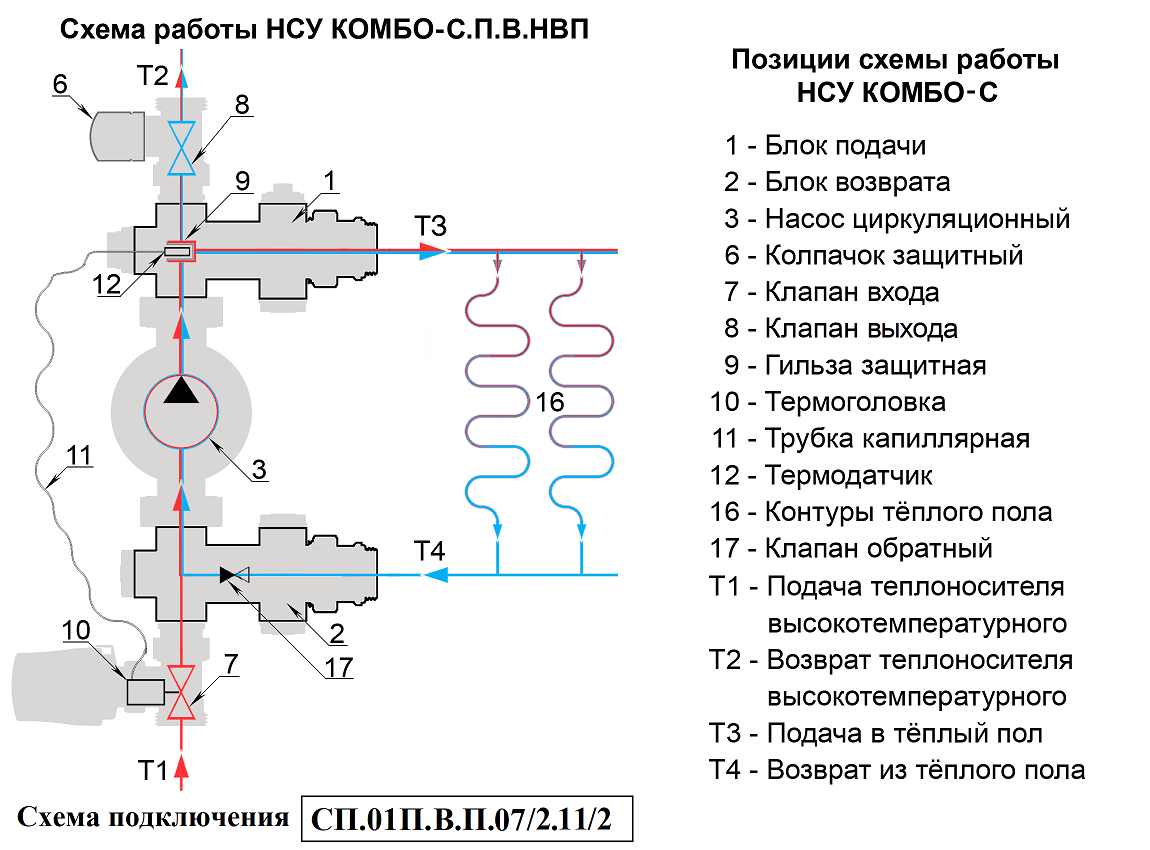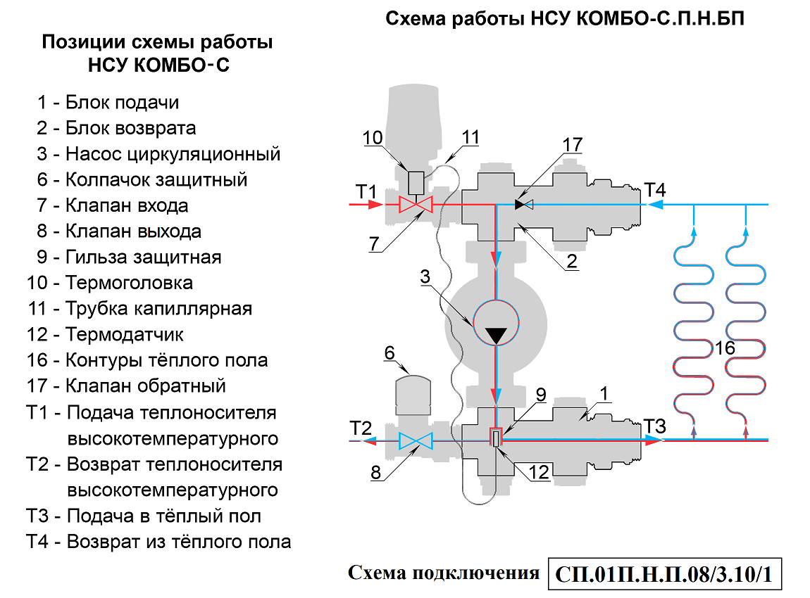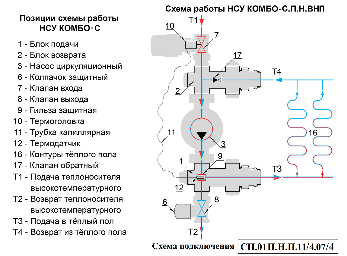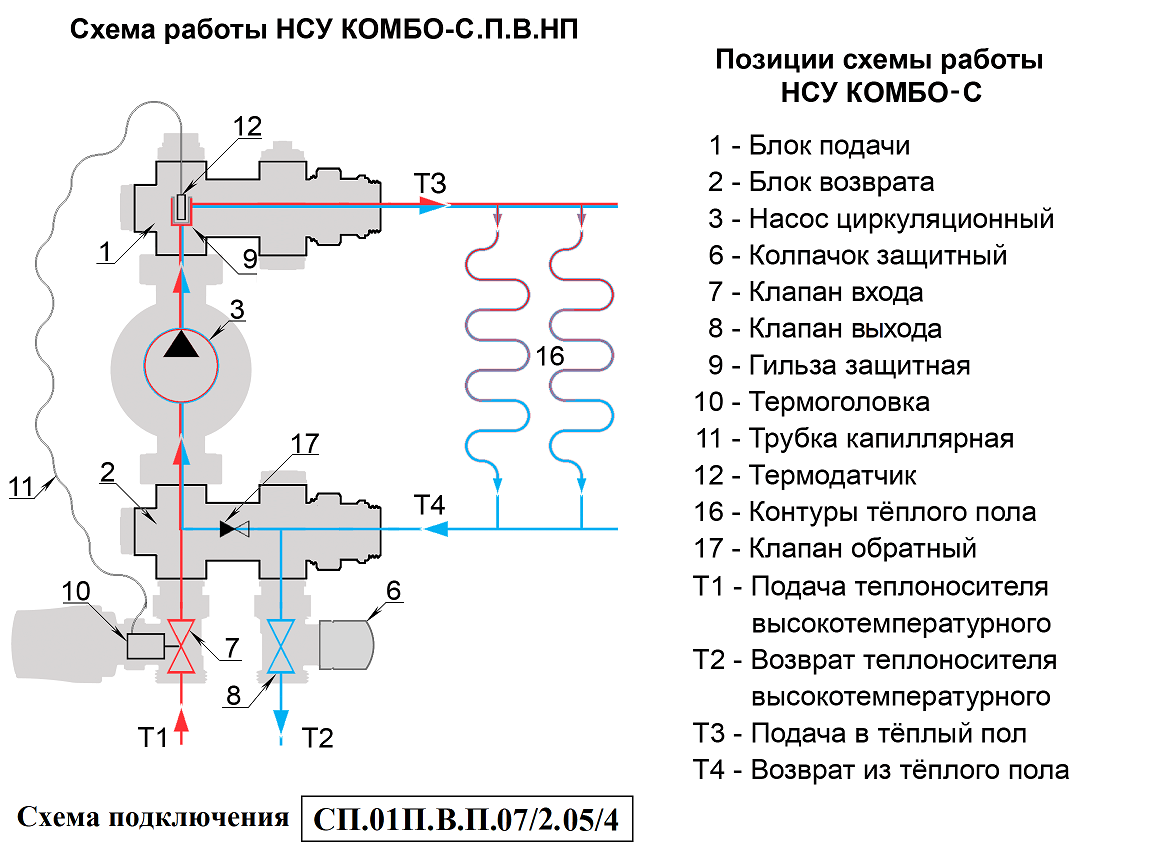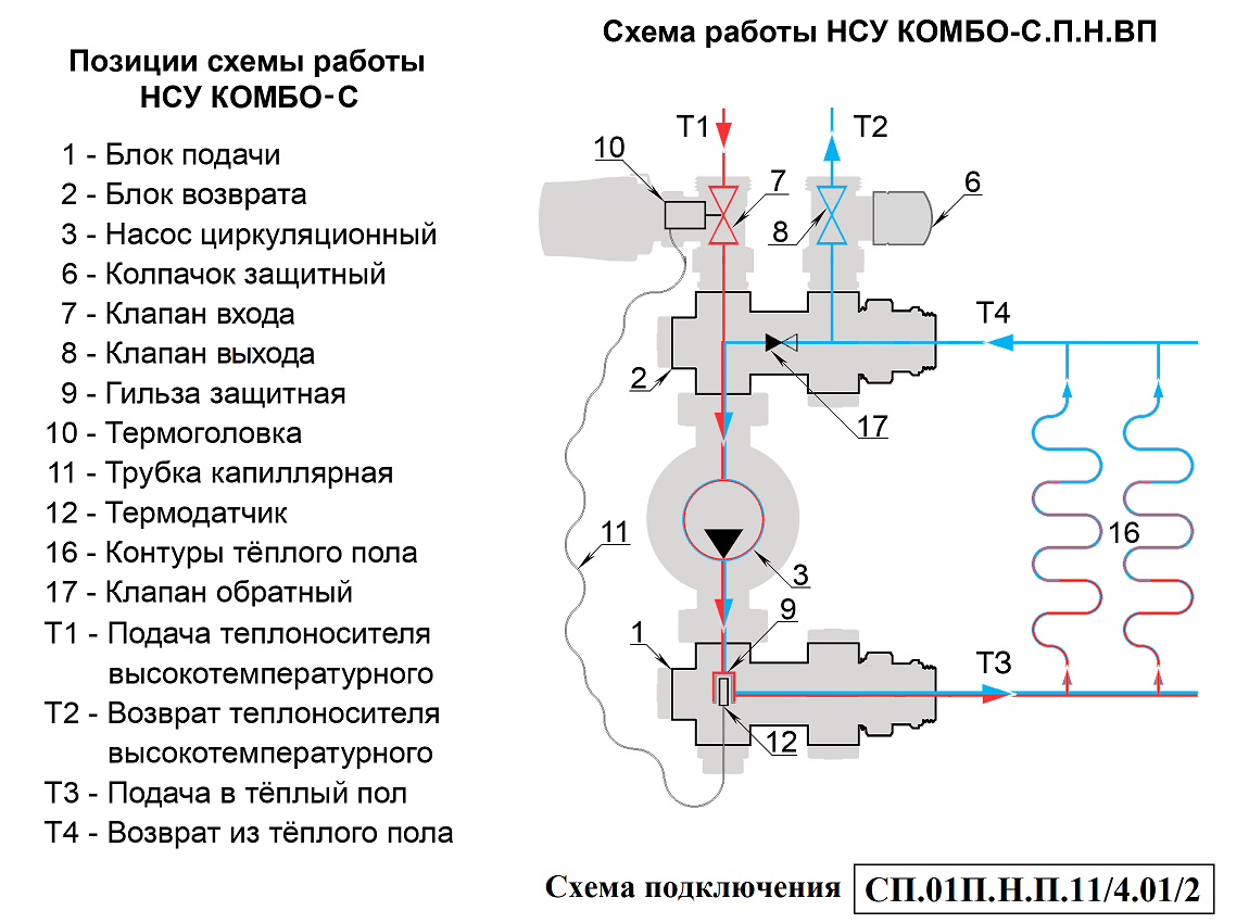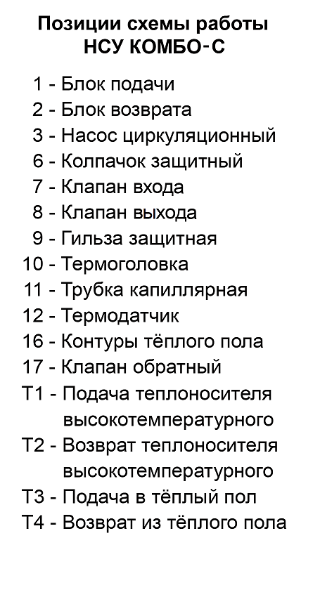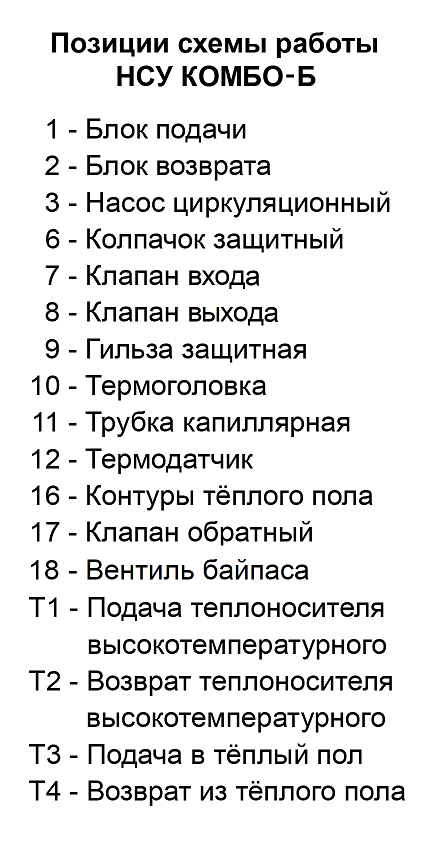 Циркуляционный насос (3) через блок подачи (1) подаёт подготовленный теплоноситель Т3 в контуры тёплого пола (16). Отдав тепло на обогрев помещений теплоноситель Т4 попадает в блок возврата (2). Откуда часть его Т2 возвращается в источник тепла и одномоментно такое же количество нагретого теплоносителя Т1 поступает в НСУ. Температура теплоносителя, подаваемого в контуры теплого пола, ограничивается преимущественно значениями 30 – 45°С. Температура задаётся поворотом регулятора термоголовки, совмещая нужное значение шкалы с указателем. Необходимая температура поддерживается автоматически, посредством изменения потока теплоносителя Т1-Т2 через регулирующие клапаны. На клапан воздействует термоголовка (10), сообщающаяся капиллярной трубкой (11) с термодатчиком (12), расположенным в защитной гильзе (9) на участке подачи. Для повышения температуры теплоносителя Т3, подмес теплоносителя Т1-Т2 увеличивается, а для снижения уменьшается.