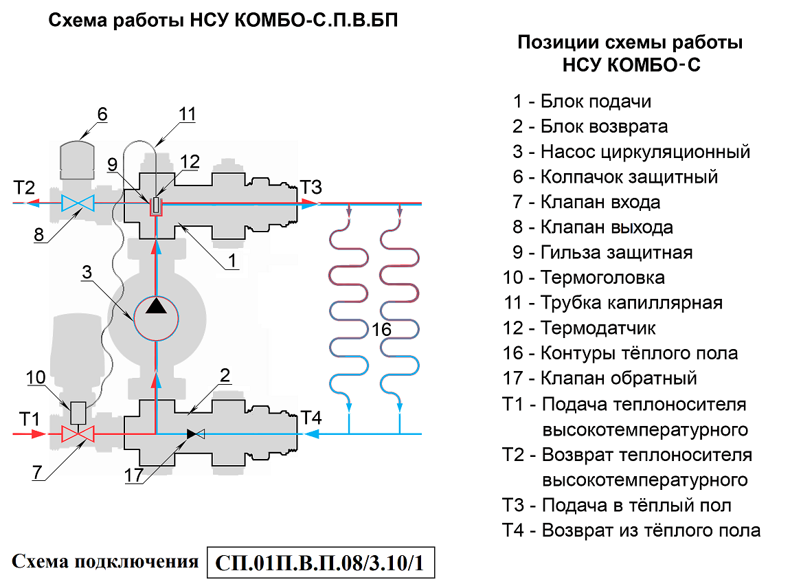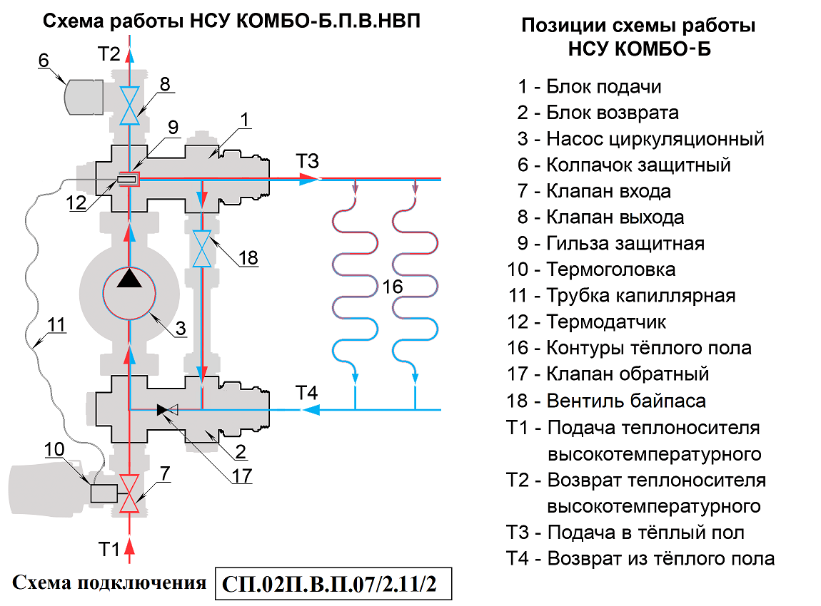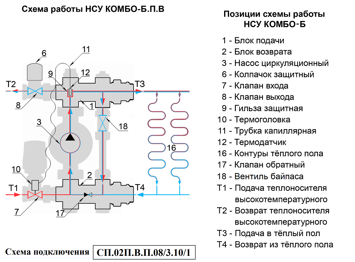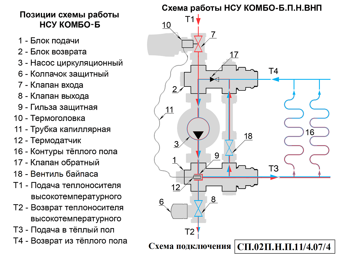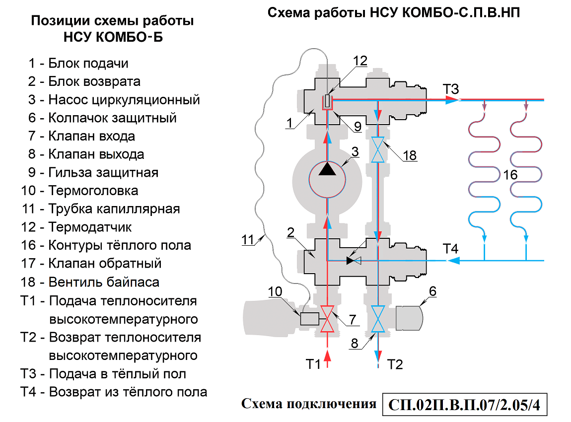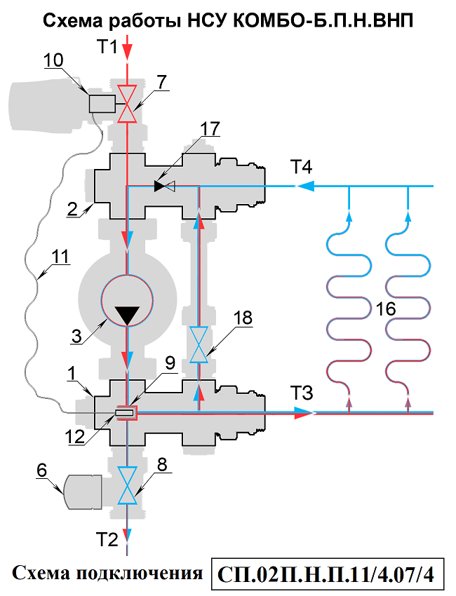 Циркуляционный насос (3) через блок подачи (1) подаёт подготовленный теплоноситель Т3 в контуры тёплого пола (16). Отдав тепло на обогрев помещений теплоноситель Т4 попадает в блок возврата (2). Откуда часть его Т2 возвращается в источник тепла и одномоментно такое же количество нагретого теплоносителя Т1 поступает в НСУ. Температура теплоносителя, подаваемого в контуры теплого пола, ограничивается преимущественно значениями 30 – 45°С. Температура задаётся поворотом регулятора термоголовки, совмещая нужное значение шкалы с указателем. Необходимая температура поддерживается автоматически, посредством изменения потока теплоносителя Т1-Т2 через регулирующие клапаны. На клапан воздействует термоголовка (10), сообщающаяся капиллярной трубкой (11) с термодатчиком (12), расположенным в защитной гильзе (9) на участке подачи. Для повышения температуры теплоносителя Т3, подмес теплоносителя Т1-Т2 увеличивается, а для снижения уменьшается.