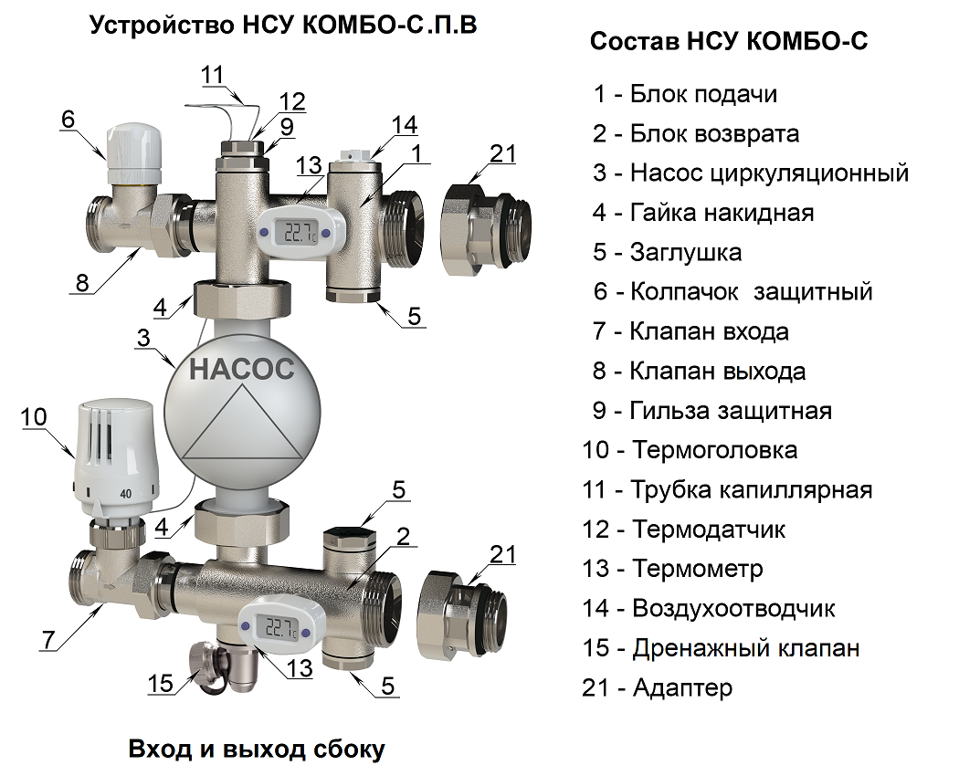 Расположение клапанов на входе и выходе НСУ позволяет закрыть тёплый пол, без использования дополнительной запорной арматуры.
