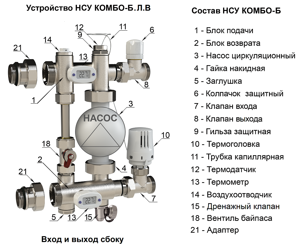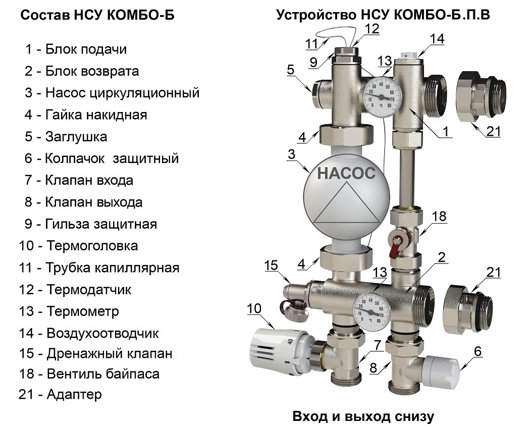 НСУ КОМБО-Б и КОМБО-С отличаются наличием у первого регулируемого байпаса, расположенного между блоками подачи и возврата. Байпас предназначен для защиты трёх скоростного насоса при закрытии одновременно всех контуров тёплого пола.