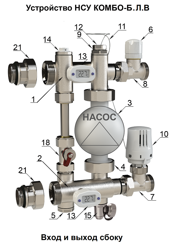 Узлы состоят из блоков подачи (1) и возврата (2), объединённых циркуляционным насосом (3) с помощью накидных гаек (4). На обоих блоках предусмотрены термометры (13).
